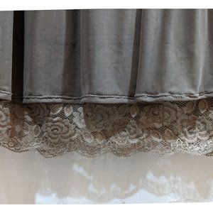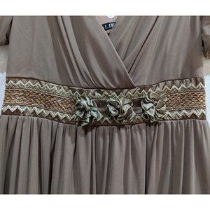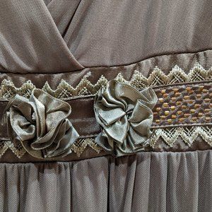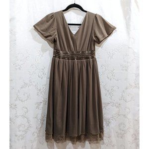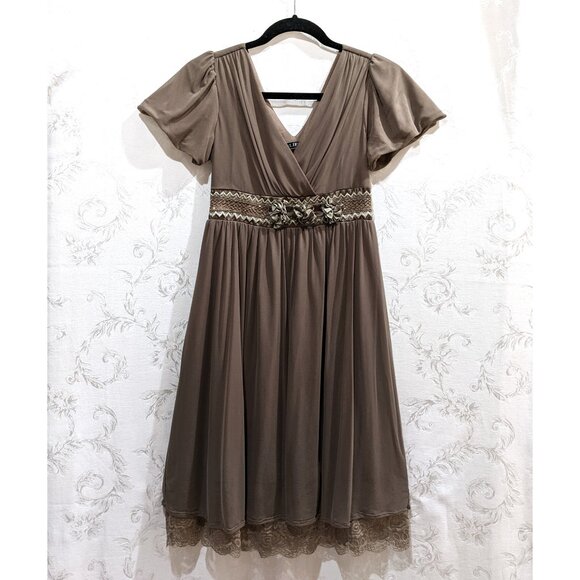 A vintage taupe Anlier tea dress in size small. Empire waist, with bead, ribbon, fabric flower, and lace embellishment. Exquisite peekaboo floral rose lace at the hem. Subtle flutter sleeves. Chiffon over, fully lined. Back elastic smocked waist, V-back, faux-wrap front. Stretch cotton-poly blend, machine washable. Like new, never worn. 34 inch bust, 28 inch waist unstretched, 37 inch length measured from top of shoulder to tip of lace.