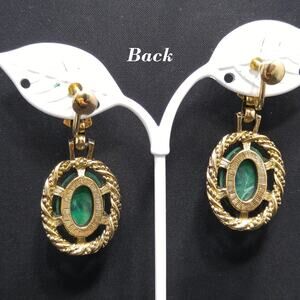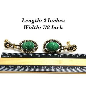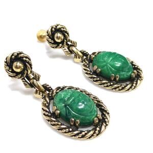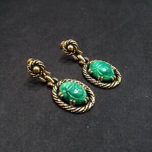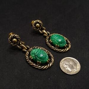 This is a beautiful pair of vintage green Peking glass scarab drop earrings from the 1950s. Each scarab cabochon is prong set in an antique gold tone rope frame and finished with screw back closures.