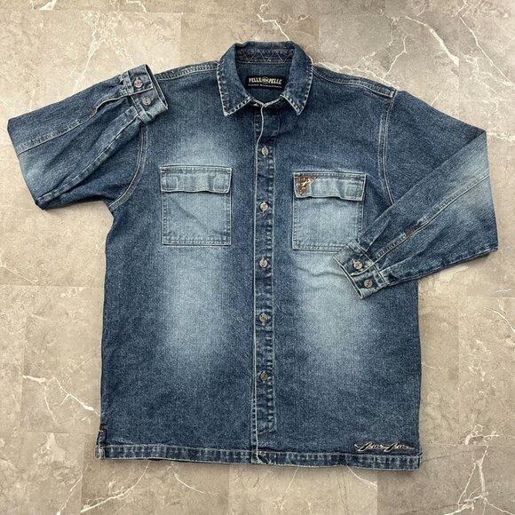 Vintage Pelle Pelle Jacket Mens XL Denim Jean Mark Buchanan Coat y2k Hip Hop Rap