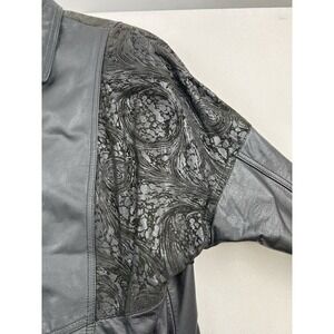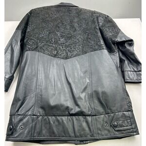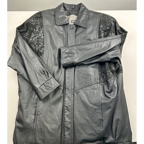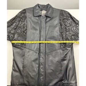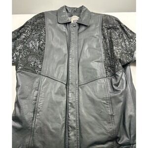 Vintage Pelle Studio Thinsulate Black Leather Coat. Mid length Jacket, not Bomber style and does not go to shins. Size Large. Has a zip out Liner. Full Zip. Two pockets in front. A design in the leather at the front shoulders and across the back. Please see photos for measurements and design.