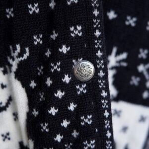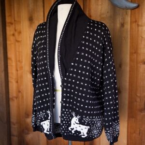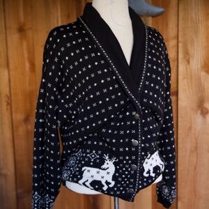 Made in USA and in incredible shape! In nearly perfect condition with little if any sign of wear. Although please view last photo for tiny spot on sleeve. 100% virgin wool vintage Pendleton cardigan sweater, complete with silver hardware buttons and the most charming prancing reindeer. Fits true to size, but also looks great oversized for a medium body type. Very festive! Classic black and white is chic and sophisticated, paring well with many outfits.