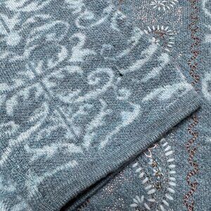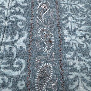 Made in Hong Kong. Paisley and botanical motif in varying shades of light blue. Some embroidery and beading throughout. Full front zip. Collar.