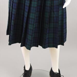 Vintage structured high waist, pleated skirt in a thick wool fabric. Classic authentic black watch tartan plaid in blue and green colors. One plastic button on the right side with a zipper for closure. Skirt is unlined.