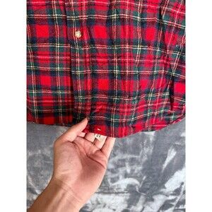 The product is a vintage Pendleton Flannel Long Sleeve Wool Button Up in a size Large, featuring a red plaid pattern. This classic button-up shirt is made of wool flannel, making it perfect for casual occasions during the winter, fall, and spring seasons. With a collared neckline, long sleeves, and button closures, this shirt offers a regular fit and includes pockets for added convenience. Made in the United States, this Pendleton Board Shirt is a timeless and stylish addition to any man's wardrobe.