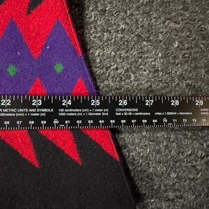 Condition: Excellent condition. Vibrant southwestern zig-zag pattern in red, purple, and black with green accents. Features snap button front, two front pockets, and full satin lining. Made in USA — a true heritage western piece with iconic Pendleton craftsmanship.