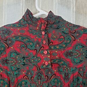 Excellent condition, see measurement photos for fit, western style high neck shirt, red and green pattern, button cuffs, button closure on back, has shoulder pads.