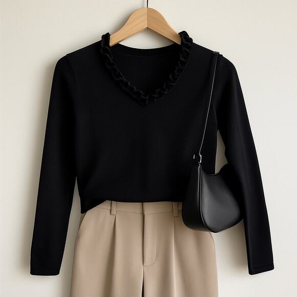 A refined and feminine Pendleton Petite long-sleeve sweater featuring a stunning silk-blend knit and a 100% silk sculpted ruffle/chain-link neckline. This piece has a timeless, elegant look that works for workwear, evening outfits, or a polished minimalist wardrobe.