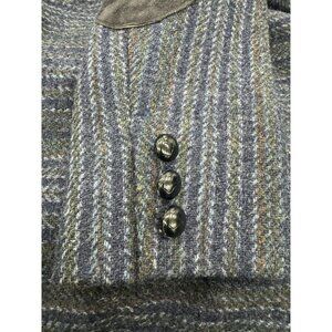 Heavy textured tweed in shades of blue and gray with that classic Pendleton quality. Navy blue painted wood buttons (we think!) with a quilted cushion pattern that adds serious character.