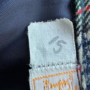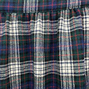 High waisted A-line knee length skirt with a blue, white, green, red & black plaid pattern. Button closures on the side. 2 side pockets. 100% Virgin Wool. Made in the USA.