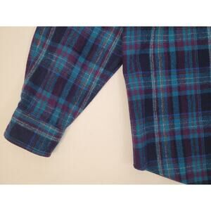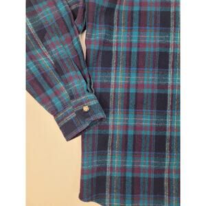 Featured is a handsome jewel-tone Pendleton plaid shirt composed of 100% virgin wool. In excellent vintage condition, this casual button-down is perfect for fall/winter to keep you warm and stylish. Made in USA. Size Large.