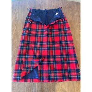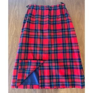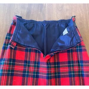 Vintage Pendleton red/navy wool skirt. Zip w/ button back closure. Slit in back. Waist measures 26’ with a little elastic. Length is 28.5’.