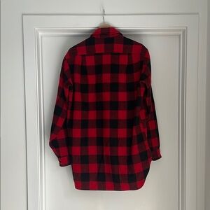 Good condition vintage Pendleton red and black buffalo check wool shirt. Features button-up front and chest pockets.