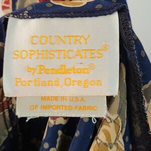 This cottage core top is by Country Sophisticates by Pendleton and has a jewel neckline. There are cuffs with buttons to close sleeves.
