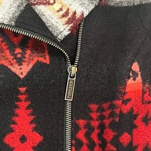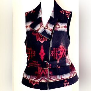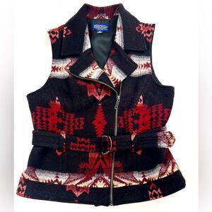 In excellent used condition Pendleton Virgin Wool Vest. The jacquard pattern is gorgeous. The zipper is asymmetrical with a belt to synch in the waist and is fully lined.