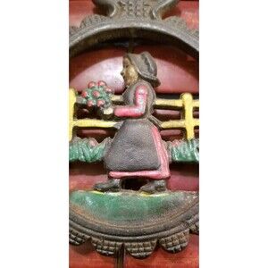 Vintage Pennsylvania Dutch Cast Iron Trivet Amish Woman in Bonnet & Apron Fraktur Good Luck Prosperity Hand Painted Details 8"x4.75"