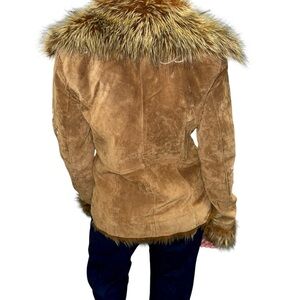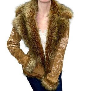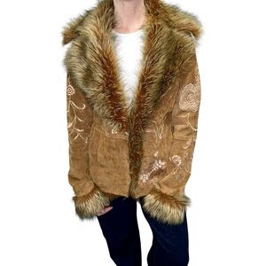 Vintage 90s/early 2000s (Y2K) penny lane 100% leather coat. Gorgeous cognac brown suede with multi tonal faux fur trim and pink embroidery floral details.