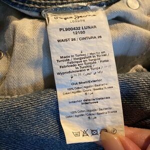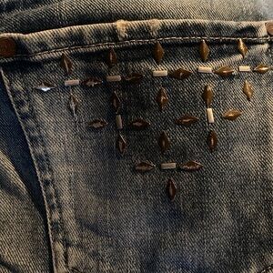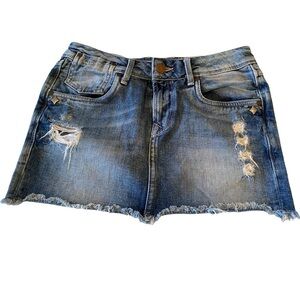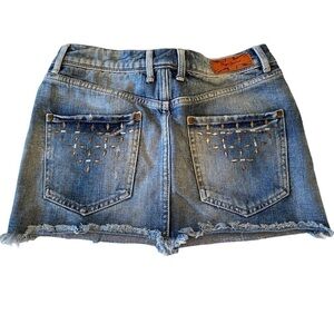 This Y2K era miniskirt has a raw hem, tips and fading. Studded pockets. Excellent vintage condition. Size 28.