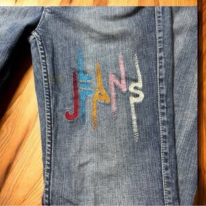 Step into 70s-style denim magic 👖🌈 These vintage Pepe Jeans London jeans feature bold rainbow embroidery, the signature stitched “P” logo at the waistband, and colorful pocket designs that seriously stand out.