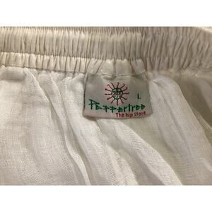 Maxi skirt with a drawstring waist and decorative elements, horizontal bands of gold and colorful chevron patterns hem. The drawstring closure at the waist is accented with tassels that have blue, red beads and sea shells