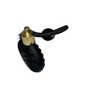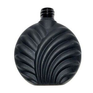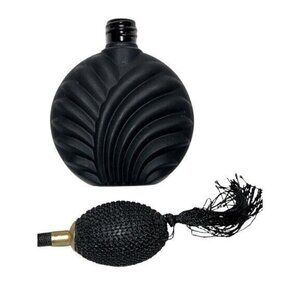 This vintage Enesco perfume atomizer combines elegant black glass with gold-tone accents. The intricate design offers sophistication and timeless appeal. The bottle features a matte black satin finish and a beautiful fan shell glass design.