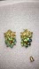 Gorgeous sparkling gold earrings with the top 2 rows shaped like rooftop design, lined with Peridot stones. Under that area is a circle of Aurora Borealis stones reflecting a lot of green aqua blue.