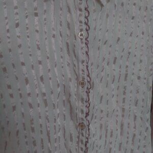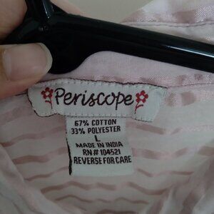 Vintage Periscope light pink striped button down top with ruffle details at the cuffs and down alongside the buttons. Collared and has button closure on cuffs. It's semi sheer and has a satin stripe print. Size large and made of 67% cotton and 33% polyester. The color is a little pinker than what my photos make it seem. In good condition.