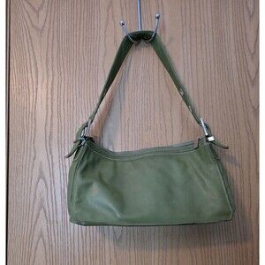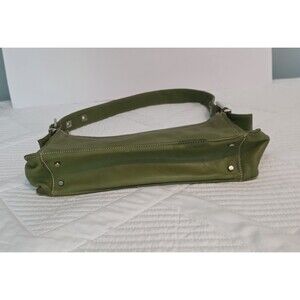 The Perlina Shoulder Vintage Leather Handbag in Celery/ Olive Green with a Pink Interior and Silver Trim is a stylish medium-sized shoulder bag perfect for travel, casual outings, and business meetings. Made from leather the purse features a zip and snap closure, a leather shoulder strap, and silver hardware accents. The bag includes inner and outer pockets, bottom studs, and an adjustable strap, making it both functional and fashionable for women on the go. Please see photos for measurements and condition.