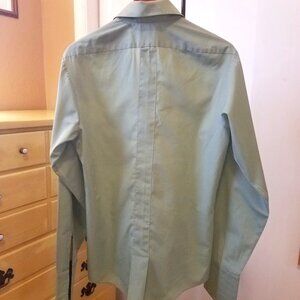 Vintage Permanent Press green button down collar shirt, men's size L. See pics for measurements. Excellent vintage condition with only a few barely noticeable flaws, as shown in the last four pics. The second to the last photo shows a number stamped on the shirt tail.