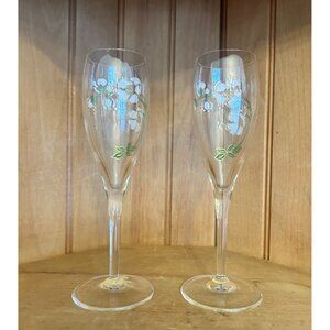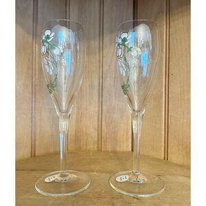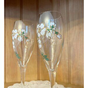 This pair of elegant champagne flutes features a delicate floral hand painted design, adding a touch of sophistication to any drinkware collection. Ideal for toasting special moments, these glasses combine functionality with artistic design, making them a refined choice for any table setting.