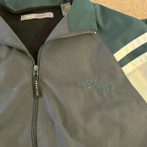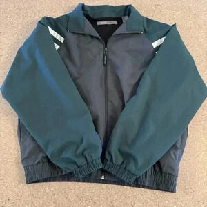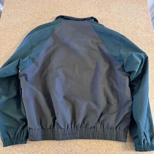 This vintage Perry Ellis America jacket is a must-have for any fashion-forward man. With a solid green and navy blue color scheme, this bomber-style jacket is perfect for travel, casual outings, or even workwear. The jacket features a full zip closure and snap buttons for added security.