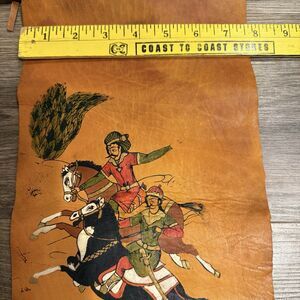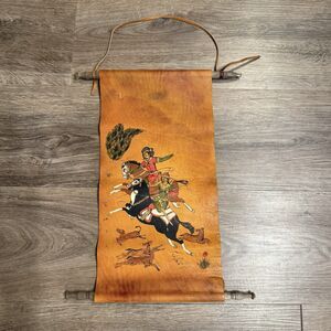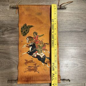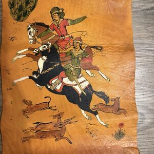 Vintage Persian Leather Wall Scroll Hand Painted Hunters Horses Archers Deer
