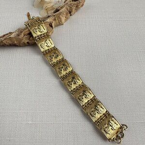 Vintage Peruvian Inca Sun God Panel Bracelet Gold Tone Hinged Link