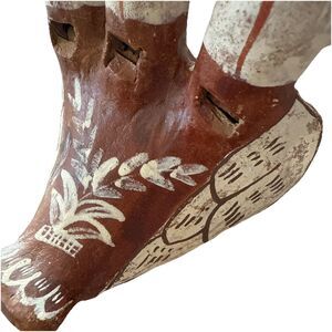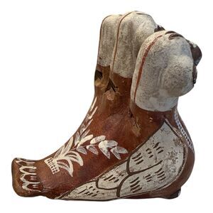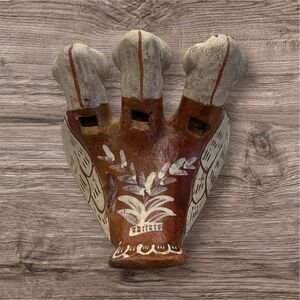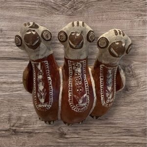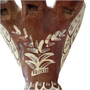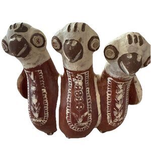 This figurine is a vintage Peruvian folk art pottery piece. Hand painted in a traditional style with natural clay tones. Painted with brown and white glaze. The design features three bird heads, a common motif in Peruvian folk art. In very good condition with no chips or cracks.