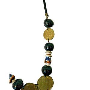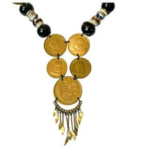 Vintage Peruvian Sol Coin Miguel Grau Necklace Black Ceramic Beads Black Leather
