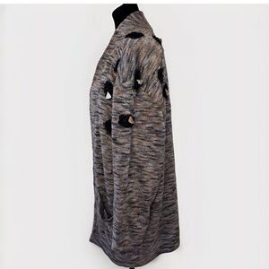 This sweater also boasts an open neckline, raised hanging embellishments, beaded accents, and slouchy pockets for added convenience. It is a designer piece that is perfect for the winter, fall, and spring seasons. Dry clean only.