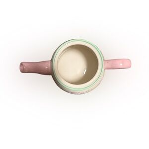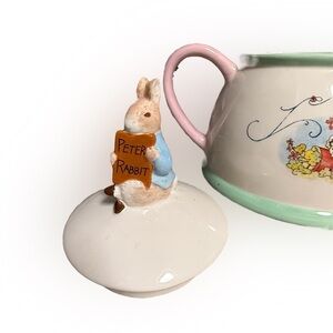 Adorable vintage ceramic teapot featuring Peter Rabbit from Beatrix Potter, holding a “Peter Rabbit” book on the lid. Beautiful pastel pink handle and spout with a charming floral garden illustration on the side. Measures approximately 9.5” from handle to spout, 6.5” tall to the top of Peter’s ears, and about 4.75” wide at the base.