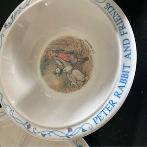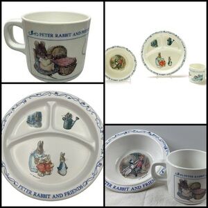Charming dinnerware set featuring Peter Rabbit and Friends. Includes a mug, divided plate, and bowl. Perfect for children's meals.