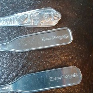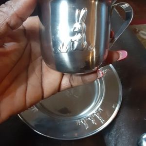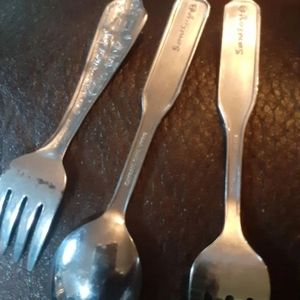 Vintage stainless flatware a five piece set plate or saucer milk cup two forks and a spoon rabbits on the plate, and folk very good vintage condition the Saucer have a few scratches on the front I have clean these items with some stainless steel cleaner they could still use a little more cleaning. Thanks for looking!