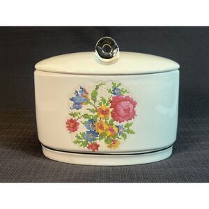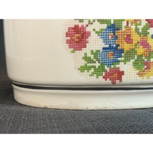 Vintage Petit Point Floral Needlepoint Harker Pottery Canister w/Lid USA Roses
