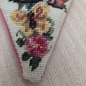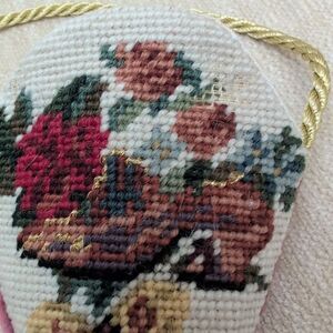 Vintage Petit Point Floral Needlepoint Scissors Case Hanging Ornament. Beautiful needlepoint design of an antique shoe and a butterfly amid florals and greenery with gold thread accents. The back is dusty pink velvet with a white cotton interior lining and a chartreuse rope hanger. Collectible vintage piece that can be used to hold your sewing scissors, hang on a wall with or without dried flowers or use as a Christmas Tree ornament. Would make a lovely gift for the seamstress in your life!