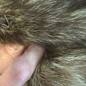 Lining shows open seams at shoulder, ripped fur at bottom of one pocket and general wear.