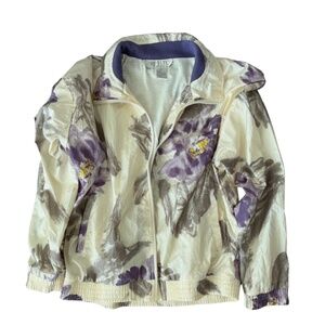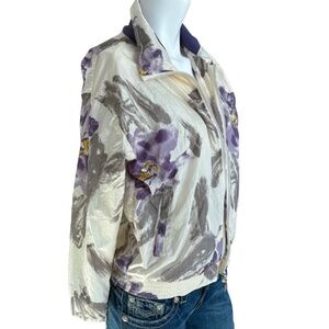 This rare Petite Sophisticate bomber jacket (Made in Taiwan R.O.C.) embodies late-80s/early-90s vintage style with its painterly floral print in purple, grey, and cream. Oversized fit with elastic hem & cuffs, collared neckline, and zip-up closure.