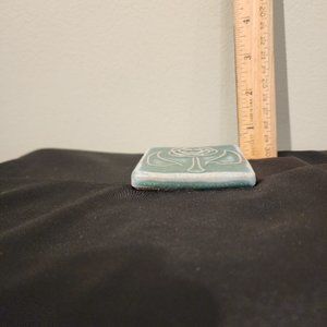 Vintage (2005) Pewabic ceramic wall tile Rose design. Approx. measurements: 2 3/4" x 2 3/4" x 1/2" deep. Semi-glossy glaze in hues of green. Stamped "Pewabic Detroit" on back and dated 2005. Hanging keyhole slot on verso. EVIDENCE OF REPAIR. Tile has been broken and glued together. Please see photos. Smoke free home. Unable to bundle.