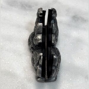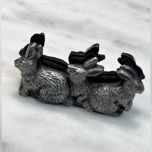 Vintage Pewter 3 Bunny Business Card Holder 3.5" x 1.4" and 1.6" tall. Such a cute piece. Excellent condition and heavy quality. Could be used to hold a picture, letter, etc.