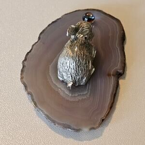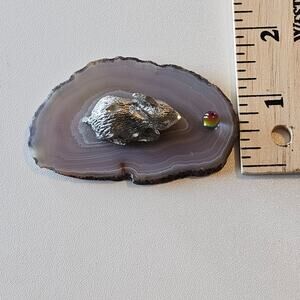 Vintage decorative collectible. Agate slice with a pewter silver bunny rabbit sitting on it gazing at a little glass ball. The ball picks up the light so it is different colors depending on the light - ranging from clear to dark to rainbow. See photos for examples of how the ball looks in different lights.