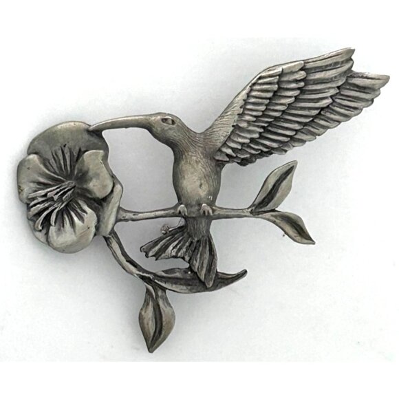 Vintage Pewter Hummingbird & Flower Brooch Pin By Spoon 2.25 Inch