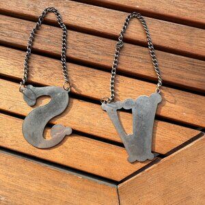 These vintage pewter decanter labels with chains are ideal for adding a classic touch to your home bar, marking Scotch and Vodka bottles.