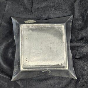 This lovely pewter bowl is square but has corners that remind of flower petals. Stable base. Original sticker is still partially visible on the side. No attempt to clean or polish has been made. This is a vintage item. Perfect to use as a centerpiece or for trinkets on a desk, dresser or in an entryway.