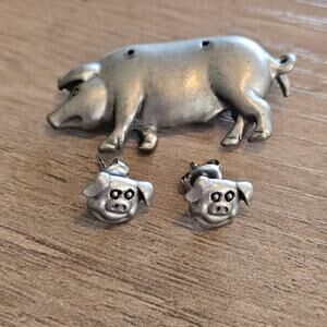 Vintage Pewter Pig Brooch with inset matching Piglet Earrings