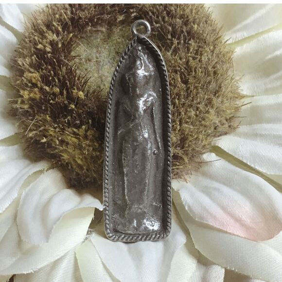 This vintage pendant features a raised relief of a robed spiritual figure — possibly a goddess or Madonna — cast in solid pewter. The arched silhouette, hand-rubbed texture, and rope-edge bezel suggest 1960s–1970s folk or mystical artisan craftsmanship. Heavy in hand at 16.74 grams, it’s a substantial piece with symbolic presence. A unique and soulful addition to any vintage or spiritual jewelry collection.